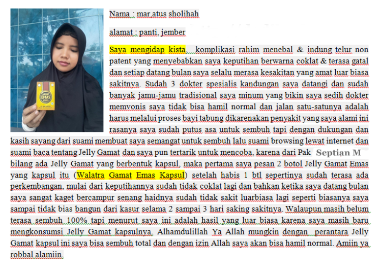 Kisah konsumen yang tekah menggunakan GOLDMAX Walatra Gamat Emas Kapsul dalam mengatasi penyakit yang di derita nya :